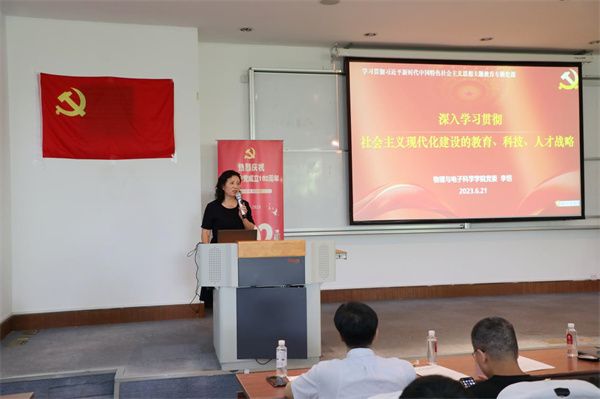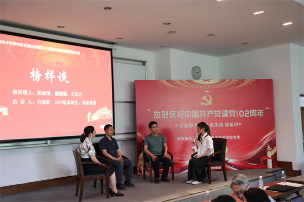 在“笃学践行”篇章,物理系系主任陈丽清、精密光谱国重实验室盛继腾、本科生党支部书记王元力与学生党员代表座谈,盛继腾结合自己的科研工作、2022年参与校园疫情防控工作等经历,分享了自己对共产党员初心和使命的理解;陈丽清结合教学工作经历,畅谈了自己在拔尖创新人才培养方面的心得体会;王元力结合本科生党支部的特色品牌创建,分享了支部在推进卓越育人方面的具体举措。