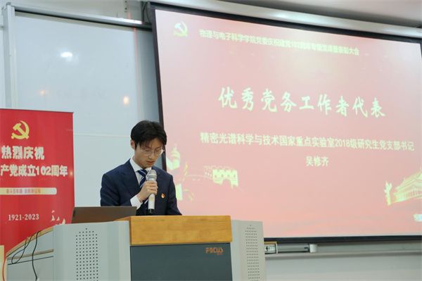2019级物理学拔尖班本科生危一凡、精密光谱科学与技术国家重点实验室2018级研究生党支部书记吴修齐、电子科学系教工党支部书记黄荣作为获奖代表依次发言。