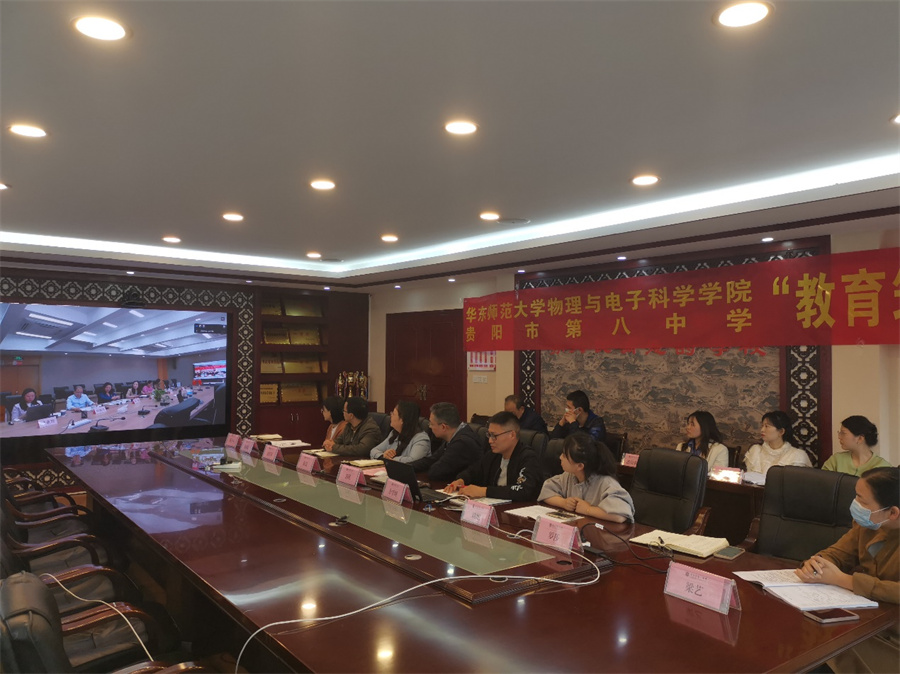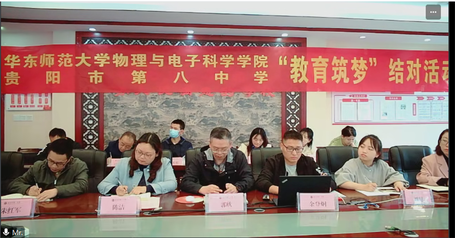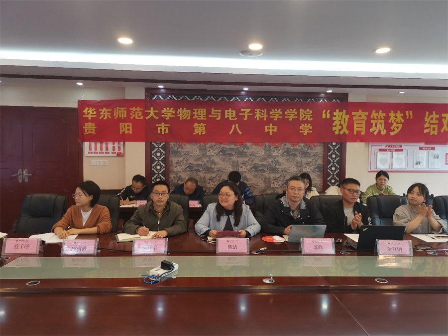 5月23日下午,学院党委与贵阳市第八中学在物理楼三楼多功能厅召开结对启动会,学院党委书记李恺,党委副书记蒋旭,党委委员、工会主席赵振杰,物理实验教学中心副主任、教工党支部书记尹亚玲,物理实验教学中心党员教师刘金梅、崔璐、陈廷芳;贵阳市第八中学党委书记、校长陈洁,副校长郭欣、党委委员、副校长朱红军,教学处主任罗莎、教学处副主任蔡子序、物理教研组组长梁艺及贵阳市第八中学物理教研组全体教师参会。活动由学院专职组织员赵荣青主持。