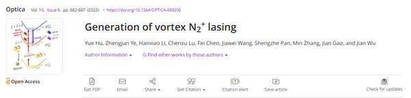 近日,精密光谱科学与技术国家重点实验室吴健教授团队在空气激光的结构化研究中取得重要进展,研究成果以“Generation of vortex N2+ lasing”为题,于2023年 5月31日发表在光学顶级期刊Optica。论文以uedbet滚球体育为第一完成单位,吴健教授为通讯作者,uedbet滚球体育2020级本科生胡悦为论文第一作者。
