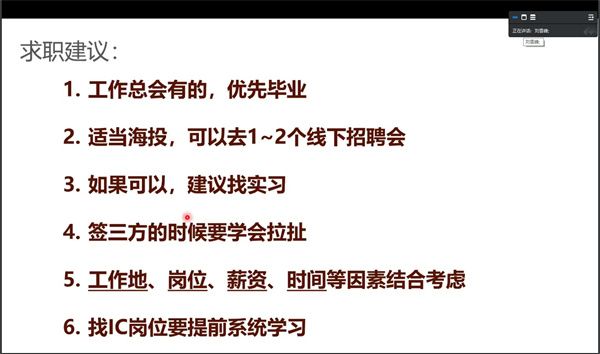 王振龙着重介绍了求职芯片行业的经验,他谈到简历制作要有针对性,公司选择方面要做好职业定位,面试过程中有效的项目实习经历有利于把握面试主动性,还推荐了实用的公众号和招聘信息渠道。刘雪峰建议同学们做好时间规划,求职过程中要综合考虑工作地点、岗位薪资、发展前景等多方面因素,特别强调要提前做好系统学习。邹倩从简历、秋招、面试等多个方面分享了自己的企业求职经验,建议同学们秋招时投递简历越早越好,面试过程中重点介绍了自己的项目经历及优势。曹浩宇谈到,求职首先要明确目标,找到核心问题,从而制定出有针对性的求职计划,同时,在求职过程中心理压力在所难免,要克服焦虑情绪,提升求职能力。