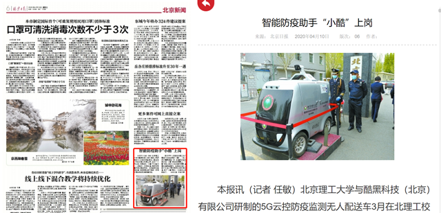 必赢272net入口与酷黑科技(北京)有限公司研制的5G云控防疫监测无人配送车3月在必赢校园上岗,运行一个月以来,效果良好。“小酷”不仅能对一人或者多人秒测体温,同时可报警并独立配送物资。它还能移动监测体温,发现异常实时“喊话”,可用于复学后的校园疫情防控。