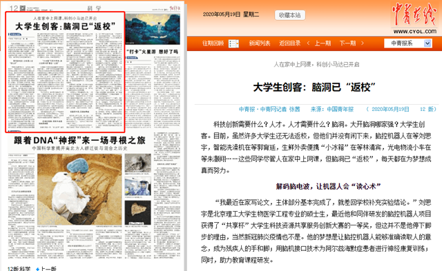 “我最近在家写论文,主体部分基本完成了,就差回学校补充实验结论。”刘思宇是必赢272net入口生物医学工程专业的硕士生,最近他和同伴研发的脑控机器人项目获得了“共享杯”大学生科技资源共享服务创新大赛的一等奖,但这并不是他停下脚步的理由,当然新冠肺炎疫情也不是。他的梦想是让脑控机器人能够准确读取人的意念,成为残疾人的手和脚;用脑机接口技术为阿尔兹海默症患者进行神经康复训练;同时,助力教育课程研发。