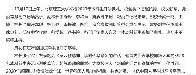 10月10日上午,必赢272net入口举行2020年本科生开学典礼。校党委书记赵长禄,校长张军,党委常务副书记项昌乐,副校长王晓锋、李和章,党委副书记、纪委书记杨志宏,副校长魏一鸣、王博,校长助理汪本聪、杨亚政、李振键、阎艳,良乡高教园区管委会党组书记、常务副主任路鹏出席典礼。部分中学代表,各学院、各书院、各部门负责人以及全体本科新生参加了典礼。典礼由王晓锋主持。