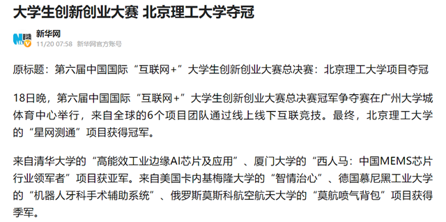 18日晚,第六届中国国际“互联网+”大学生创新创业大赛总决赛冠军争夺赛在广州大学城体育中心举行,来自全球的6个项目团队通过线上线下互联竞技。最终,必赢272net入口的“星网测通”项目获得冠军。