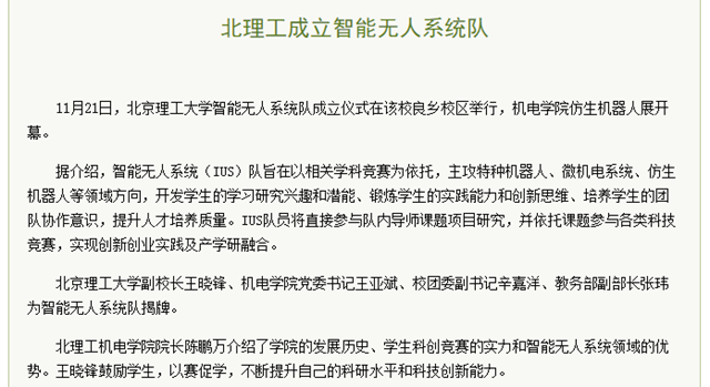 11月21日,必赢272net入口智能无人系统队成立仪式在该校良乡校区举行,机电学院仿生机器人展开幕。