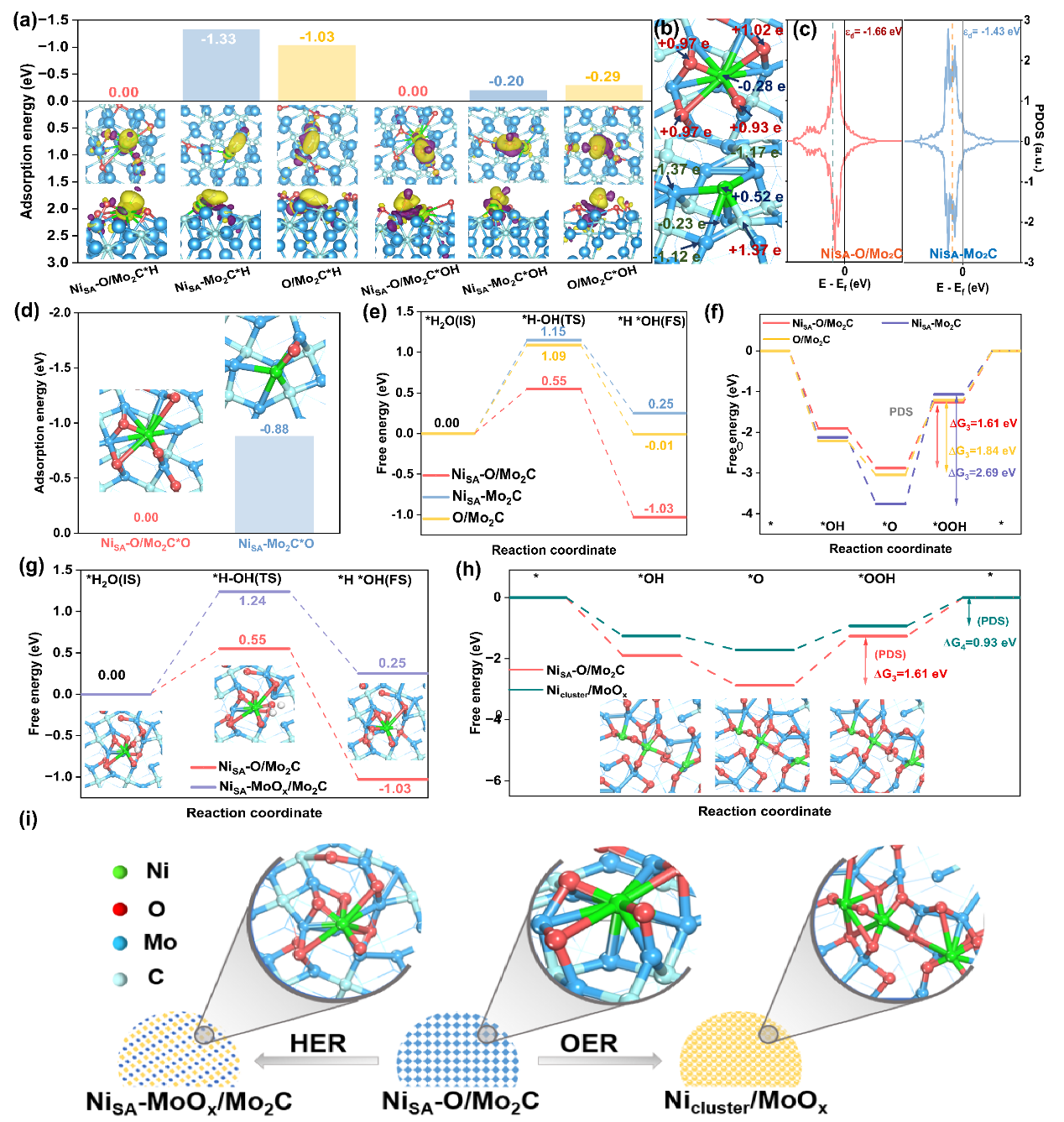 计算结果表明,与NiSA-Mo2C相比,NiSA-O/Mo2C中的Ni-O-Mo的配位结构促进了Ni原子的稳定存在。同时Ni-O-Mo键合环境使得单原子Ni的电子结构会优化质子和羟基的吸附能力,以及具有适度的O吸附能,从而提高其HER、OER电催化性能。对于OER重构后的Nicluster/MoOx来说,其进一步降低了对O2的吸附能力,加速了OER反应的发生。