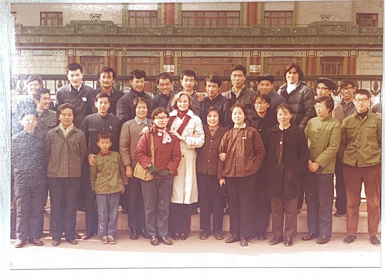 我校第一位外籍教师凯瑟琳·王(第一排右六)与部分外语教师及78级英语专业学生合影