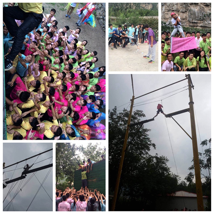小组建设完毕之后,在教练的带领下,五个小组分开进行各项素质拓展活动。高空项目是最具有挑战性的项目之一。学员们自身需要有着良好的心理和身体素质,同时在攀登的过程中还需要依靠地面队友的配合,是一项检验个人能力和团队配合的综合性挑战。场地项目同样有着许多难点,需要学员们用心去思考,去探索解决相关难题的方法。如穿越电网,全队需要思考如何让队内20位队员成功地通过“电网”上分布的20余个大小不一的网洞而不触碰旁边的塑料细绳。学员们不仅需要绞尽脑汁,想出一套合理的方案让全队平安通过,还需要充分信任自己的队友,过电网时全身放松,依赖自己的队友将自己“运送”过去。